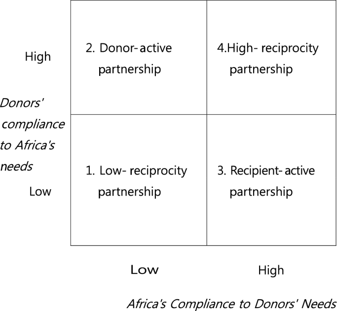 A 'recipient-active' partnership would be rare in Africa, where countries are highly receptive to donors aid programmes, actively and voluntarily undertaking the necessary measures to make them work (with sound governance), while donors, in comparison, are not as proactive. 34 South Korea in the 1960s may fall into this category. Lastly, a 'high-reciprocity' partnership is an ideal situation where both donors and recipients will get satisfaction and credit for a strong and successful partnership. An example of such a case could be Rwanda.